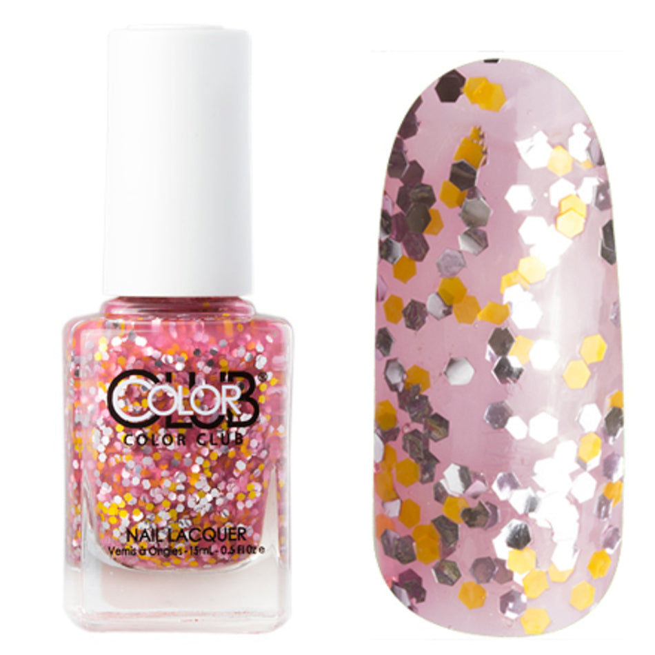 Color Club's Girl Code is a tinted sheer pink nail polish packed with silver and yellow glitters. Images show Girl Code painted over a dark base.